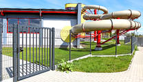 Kapuk 6 méternél szélesebb nyílással, a kapu 90°-ban mozog